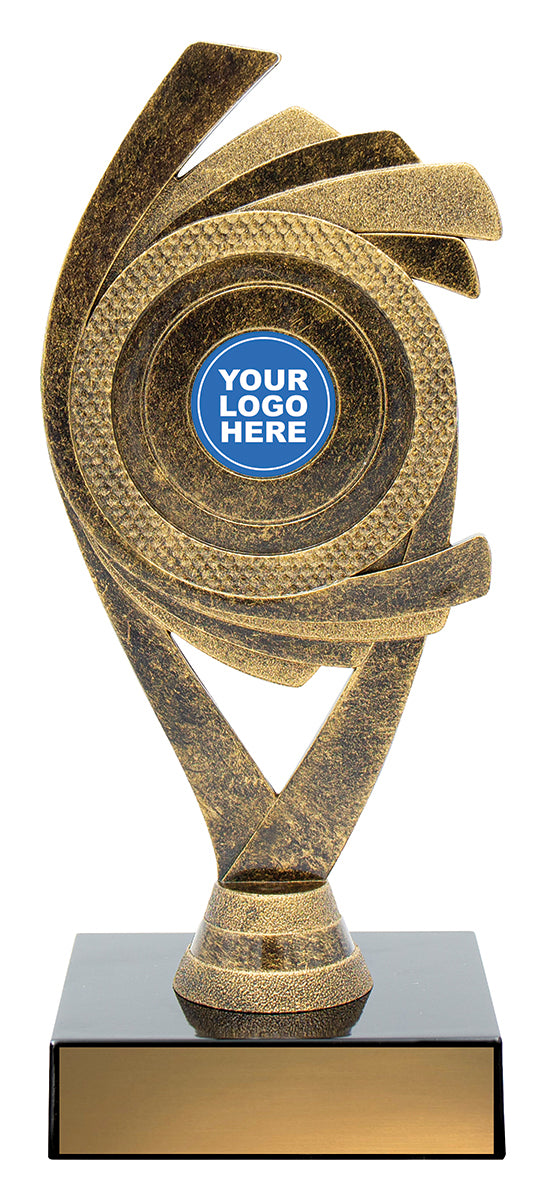 Dynamic design of holder trophies rendered in antique gold colours - Juno showcases your club logo over multiple sizes.