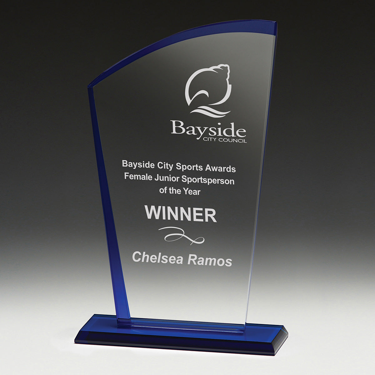 The Glass Blue Shadow award features an appealing curve design to frame your engraving requirements. Complete with vibrant colour elements, the design offers a great value award suitable for a range of events.