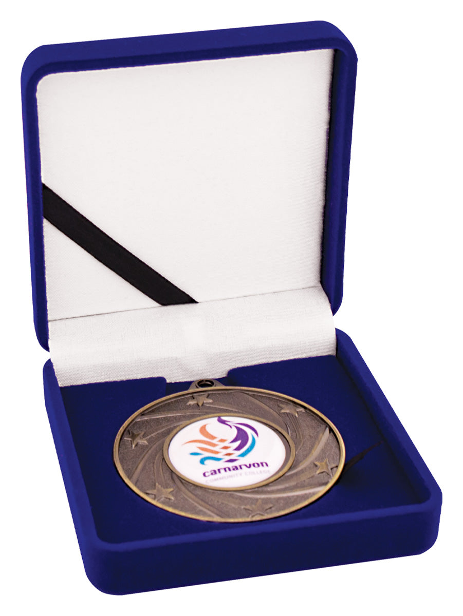 Prestige medal box for common style 50mm diameter medal. Finished with nice blue velvet with white inlay feature. Medal box will elevate the standard of your medal display.
