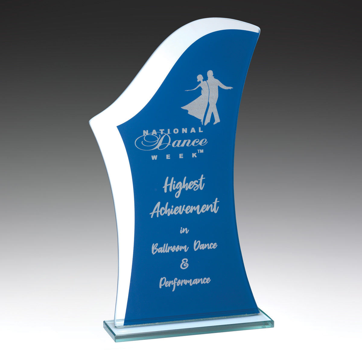 Wave inspired design for this affordable series of glass awards make an excellent budget choice. Panel of bright blue allows for precise and standout engraving.