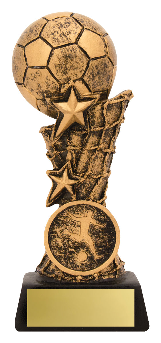 Effective design that showcases the football atop a stylish goal net tower - finished in classic antique gold colours and black base. This design starts at a reasonable price point making this generic theme a great choice for participation awards. Space for insert also present.