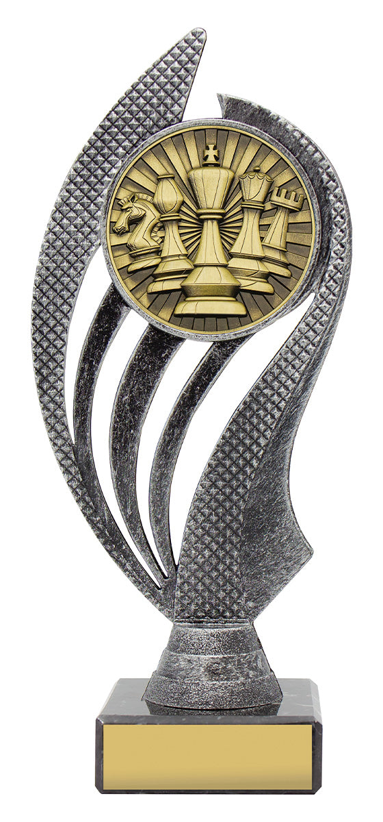 Husky series of trophies on premium black marble allows for different award options for your activity. Appealing antique silver and gold combination over number of sizes.