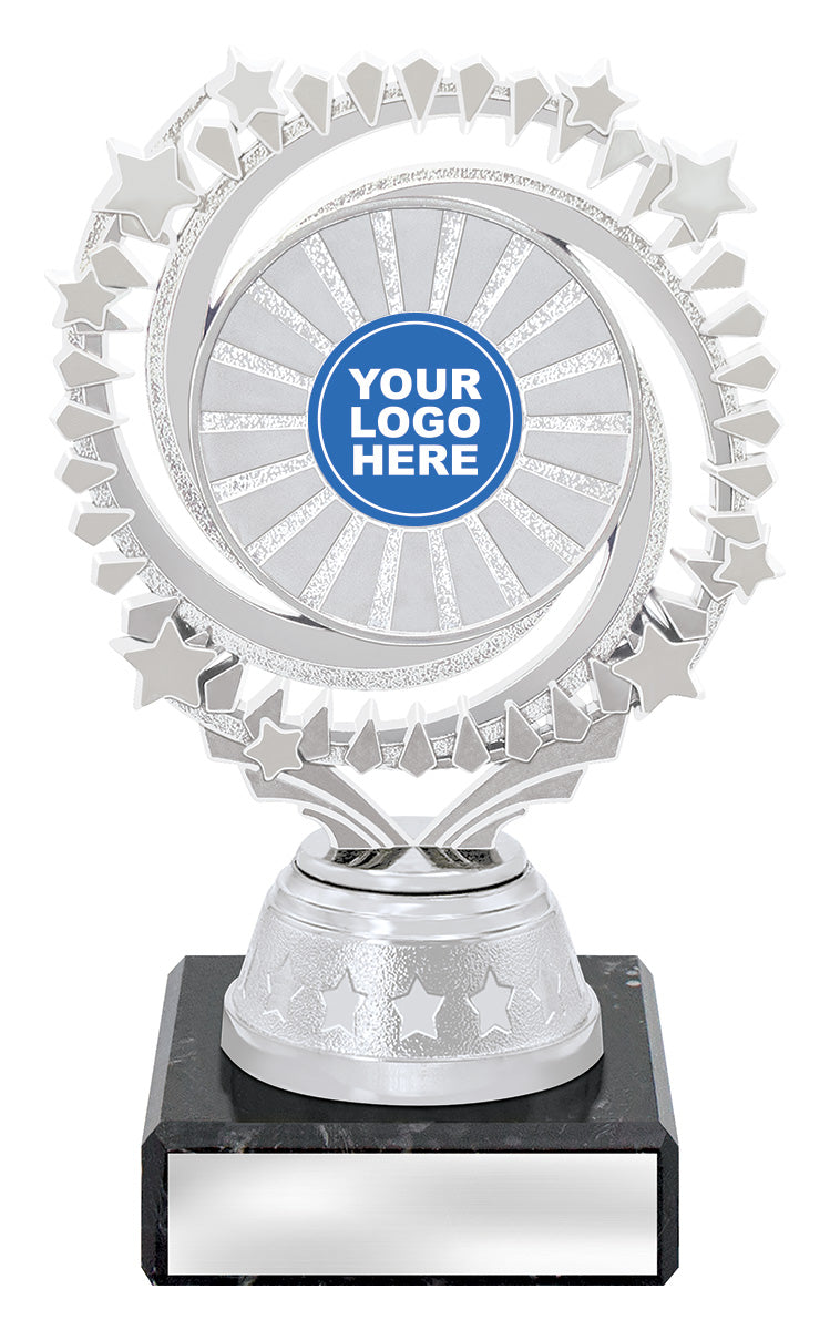 Cosmic series of affordable trophies feature star spangled holder in gold or silver - choose colour of column to suit your order. Suit 25 or 50mm centre insert.