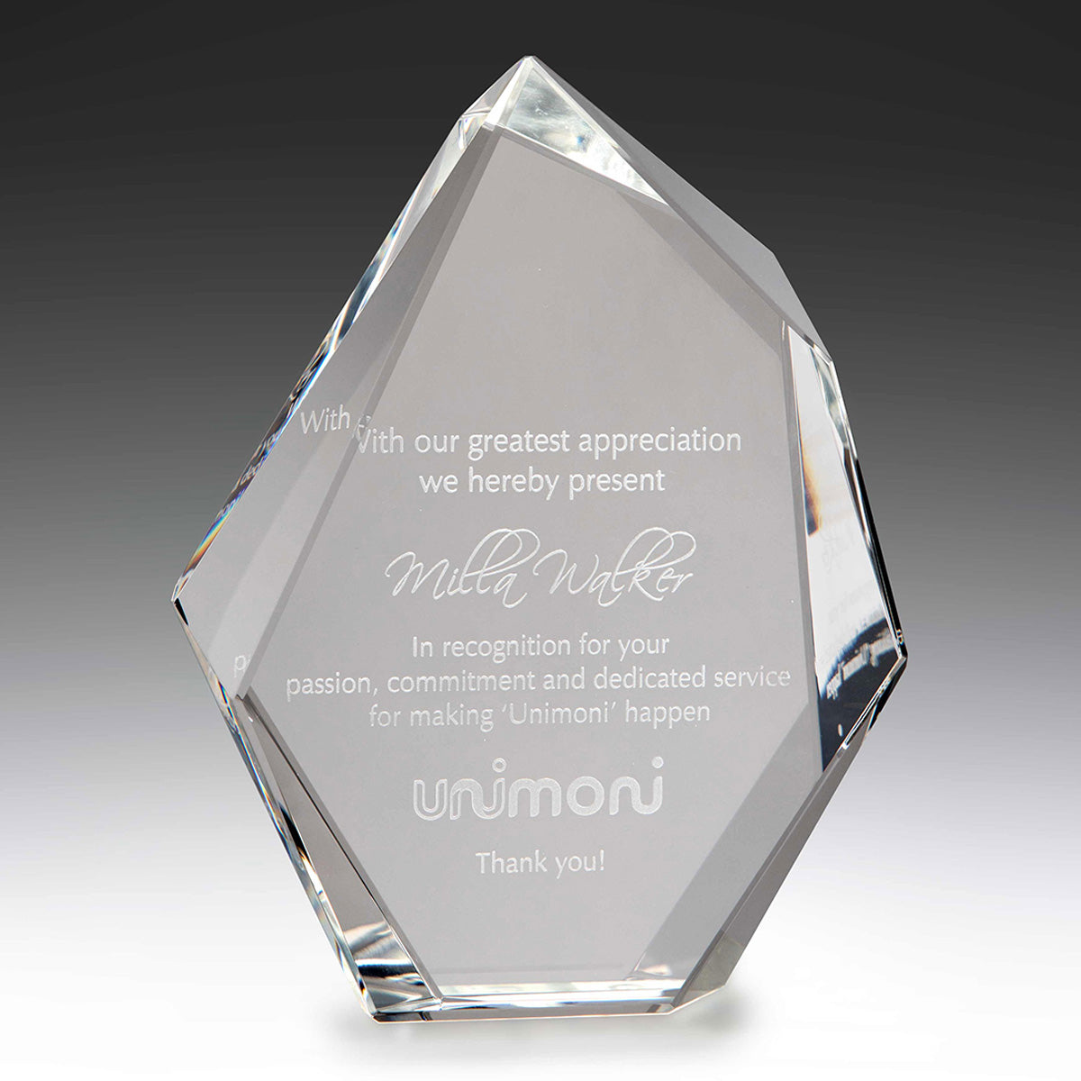 Smaller size crystal award with precise facet-like edges is suitable for more affordable budgets. The crystal award can be used with the more prestigious 'Mountain' series.
