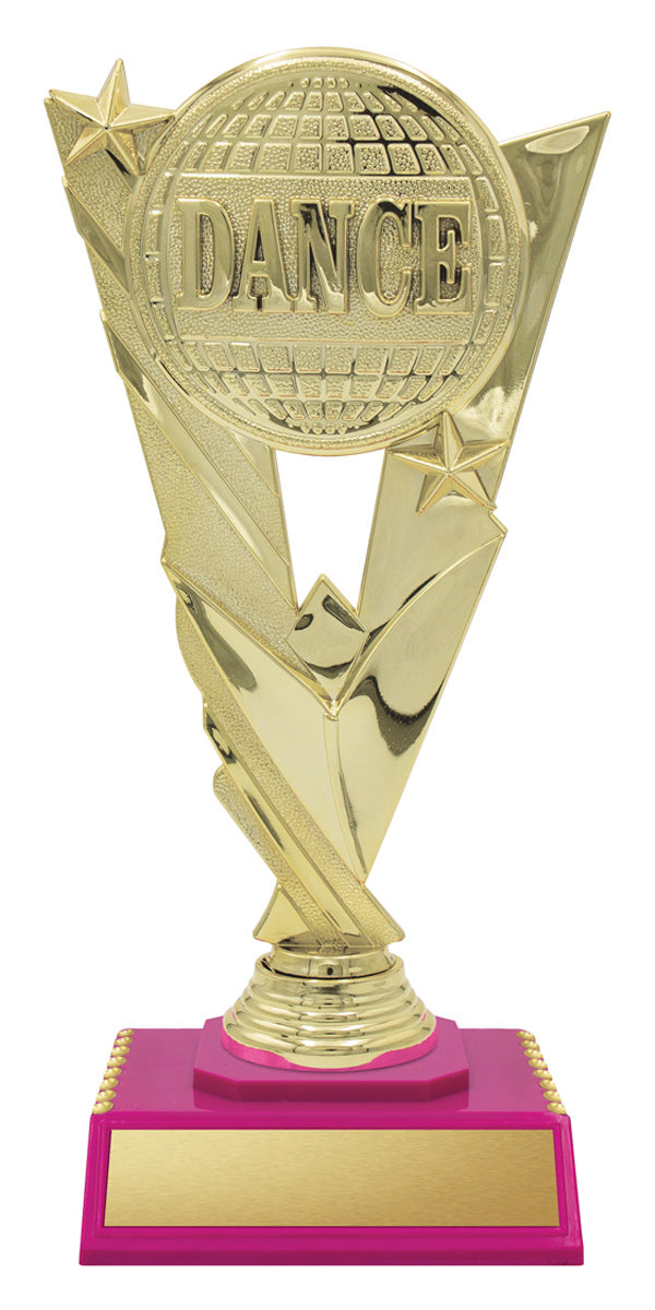 Effective & affordable dance trophy with exciting gold top on classic pink base.