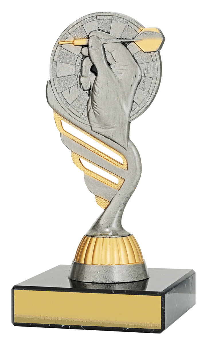 Classic darts theme finished in antique trophy silver on premium black marble over multiple sizes.
