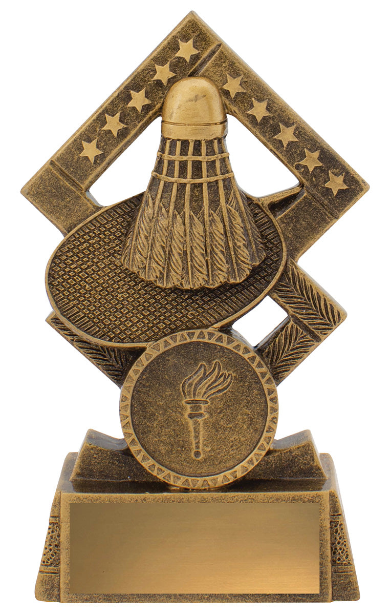 Excellent pair of badminton trophies well suited for larger club orders feature racquet & shuttlecock design and eye-catching multi-star elements. Great position for your club insert.
