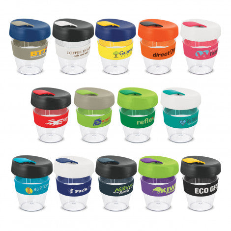 Crystal-clear 350ml reusable coffee cup with a heat-resistant silicone band and a secure screw on lid with a splashproof flip closure. The cup is manufactured from AS plastic and the lid is polypropylene. Both materials are BPA-free. The lid, flip closure and band can be mixed and matched in any colour combination from the standard colours at no extra cost. Up to five different colour combinations are included in the price and more are available for an additional charge. It can be presented in an optional natural gift box on request. This product is not dishwasher safe and handwashing is recommended. Express Cup Claritas is protected under New Zealand Design Registration No. 419451 and Australian Design Registration No. 361937.