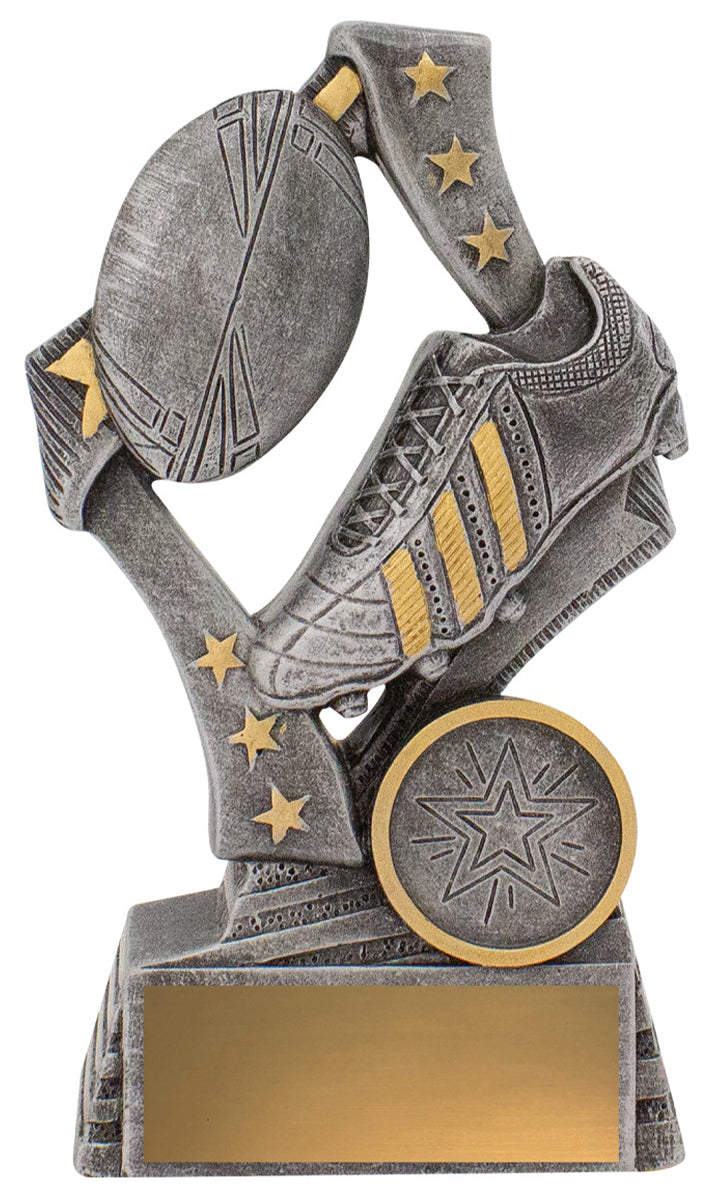 Dynamic rugby trophies perfect for league or union - for players of all ages, male and female. These 'Flag' trophies feature a stylish star based design with iconic boot and ball elements.