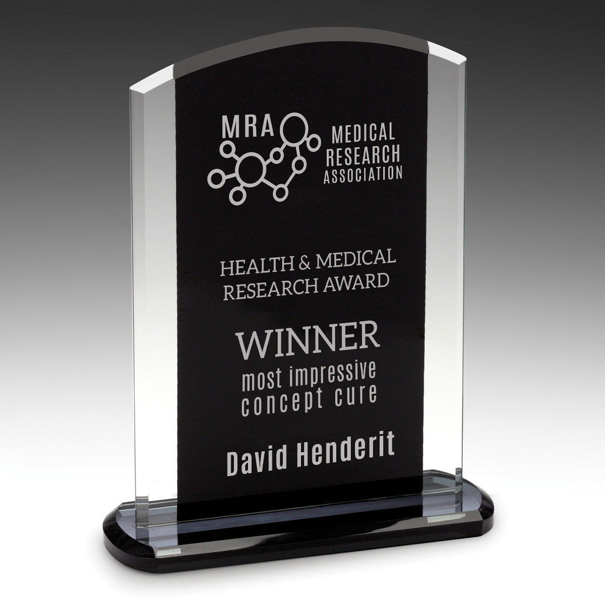 Affordable glass award option features a classic arch design and black panelling to allow for precision engraving. The Florence Glass Award is available in 2 sizes and is supplied in presentation gift box.