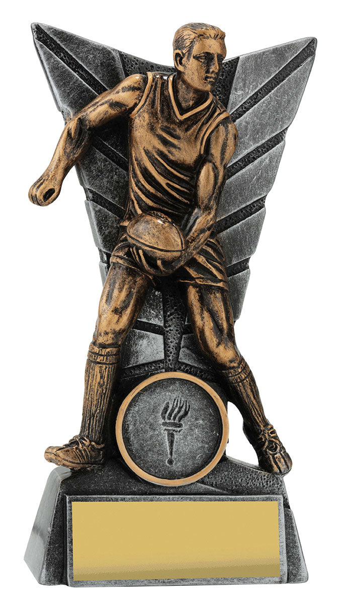 Elegant silver backdrop for this trophy series frames the detailed player captured in action. Footy trophies available in male and female and in multiple sizes to suit your award needs. Excellent choice for best player trophies for your team or club.