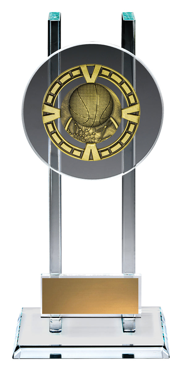 Bold glass awards are perfectly suited to recognise the top achievements at your team or club. Elevated glass platform showcases a brilliant metal theme for your sport or activity - space for your engraving as well.