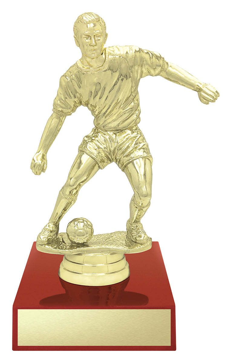 Red timber trophies feature soccer figurines - choose male or female - available in 4 sizes. Timber trophies available in different colours to suit your football team or club.