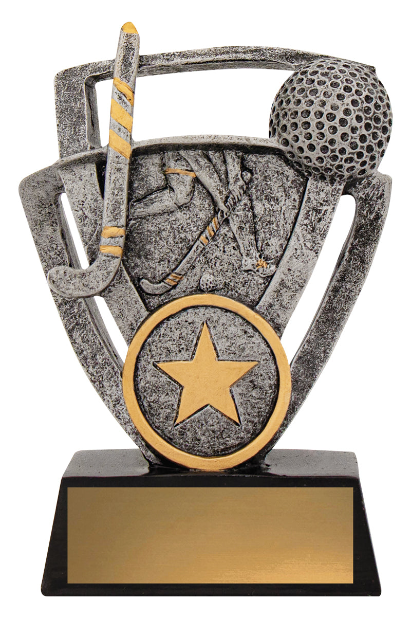 Hockey budget trophy series in antique silver and gold, a popular choice for clubs and teams. Hockey trophies feature an effective design with prominent field hockey elements. A generic theme award with the option for customisation.