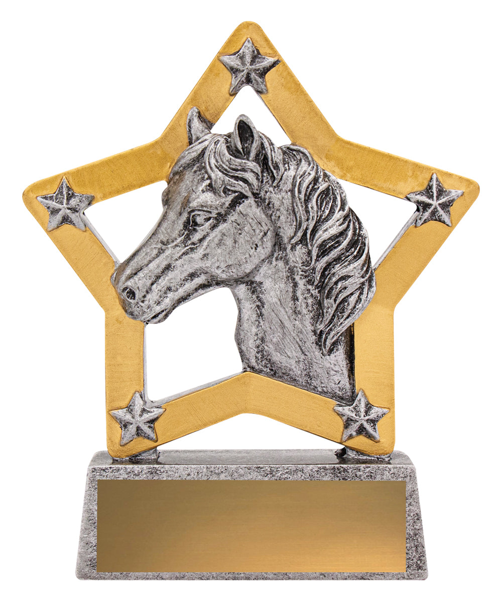 Affordable and popular Mini Star trophy for a variety of horse related activities. An attractive star inspired design, classic silver and gold colours, these horse trophies are well suited for large orders.
