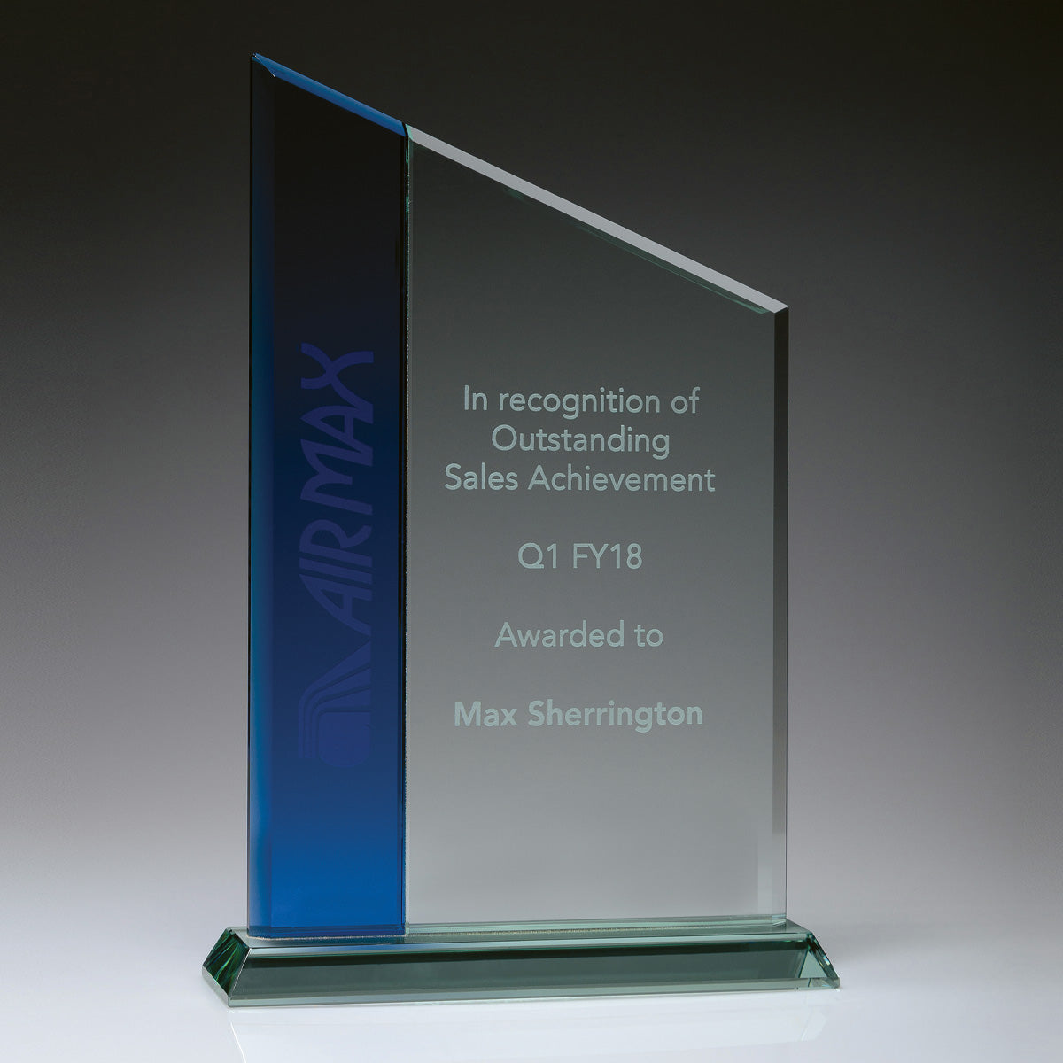 The Jade & Blue Peak series is a big seller with the 'peak' design popular for corporate and achievement style awards events. The jade and blue elements combine to present an impressive design.
