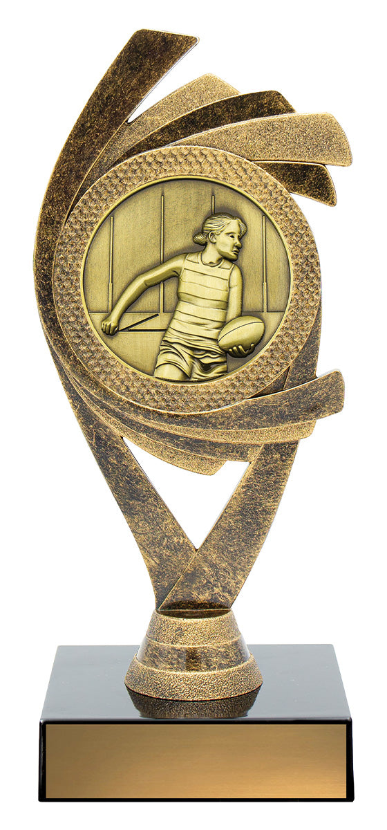 Dynamic design of holder trophies rendered in antique gold colours - male or female available.