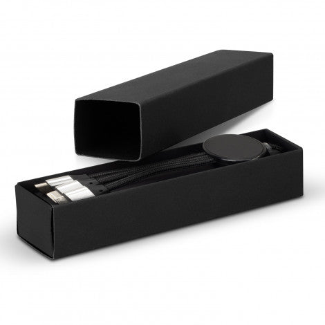 Illuminating 120cm Type-C charging cable with dual input USB-A and Type-C and triple output Type-C, Micro-B USB, and Lightning. Lumos features a built-in LED that illuminates the engraved branding when in use, and the braided cable increases durability.
