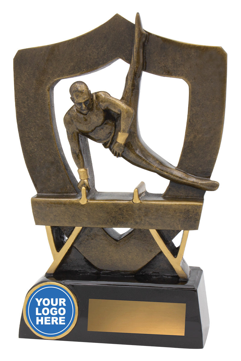 Gymnastics trophy featuring a traditional shield inspired design, specifically for male participants. Possible prestige award to complete your trophy selection. Finished in classic antique gold trophy colours and with space for 25mm insert if required.