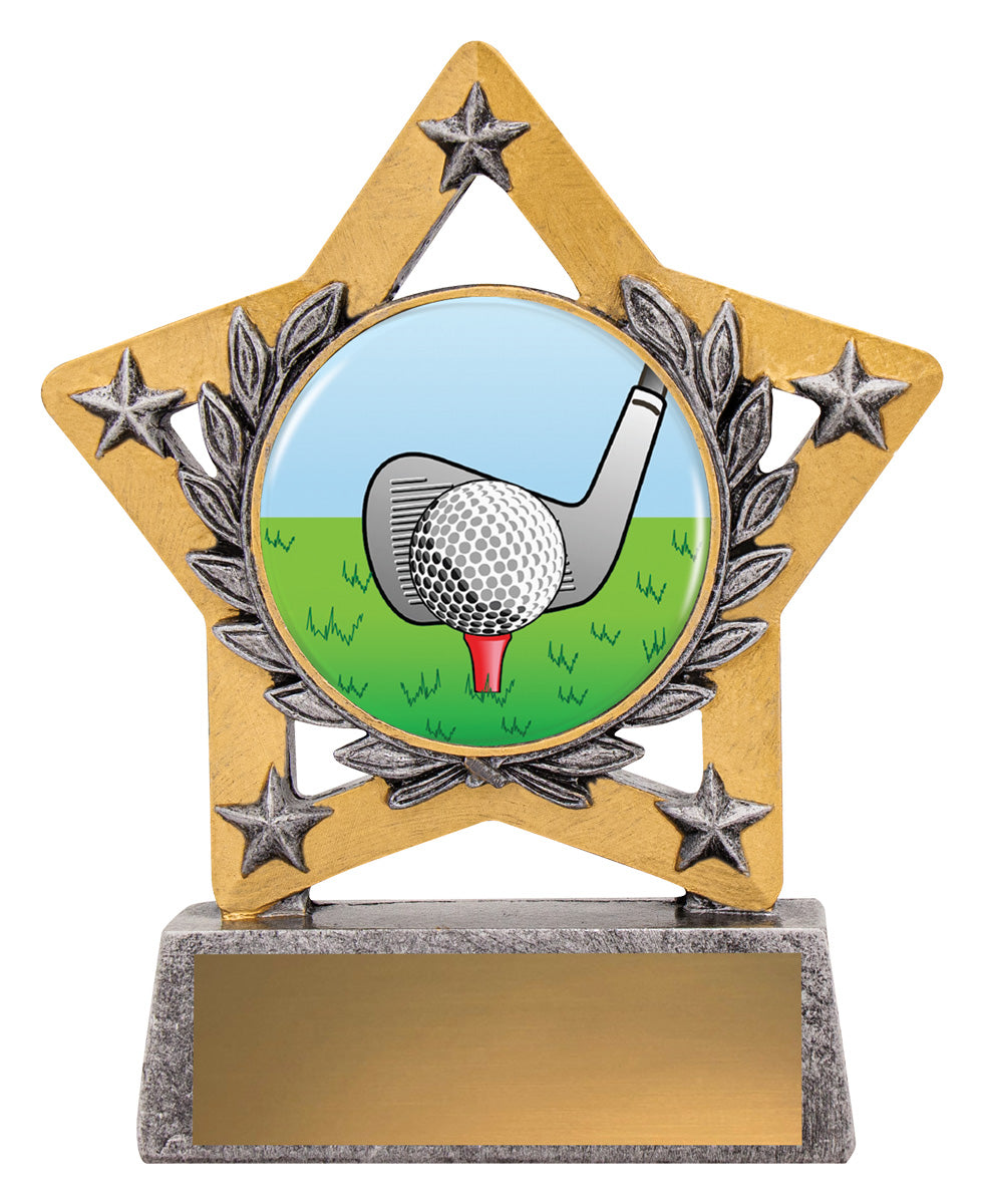 Star inspired design with traditional gold and silver colours - showcase brilliant colour image for your sport or activity. Mini stars offer great value.
