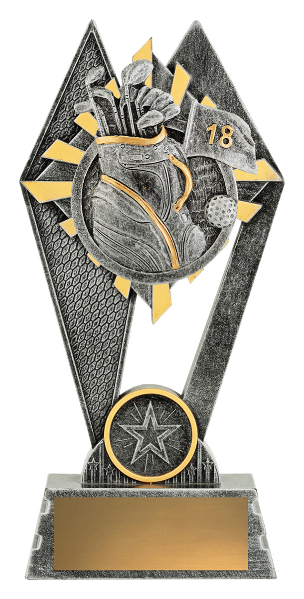 The Peak Series - for Golf - is an innovative trophy series offering super value for such an impressive size range. An elevated design that showcases the iconic golf bag, ball and pin elements against a vibrant sunray style background. Check out the Peak design in your sport or activity.