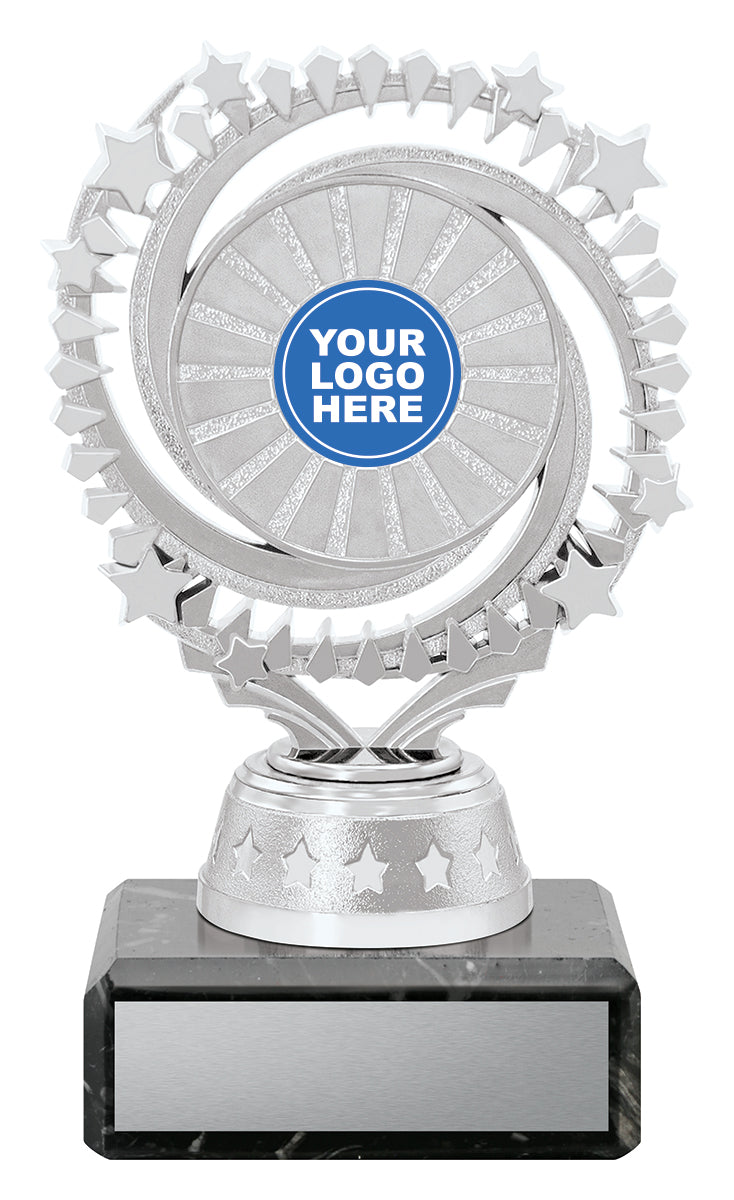 Swirling silver holder with multi star elements to showcase your custom logo over number of sizes.