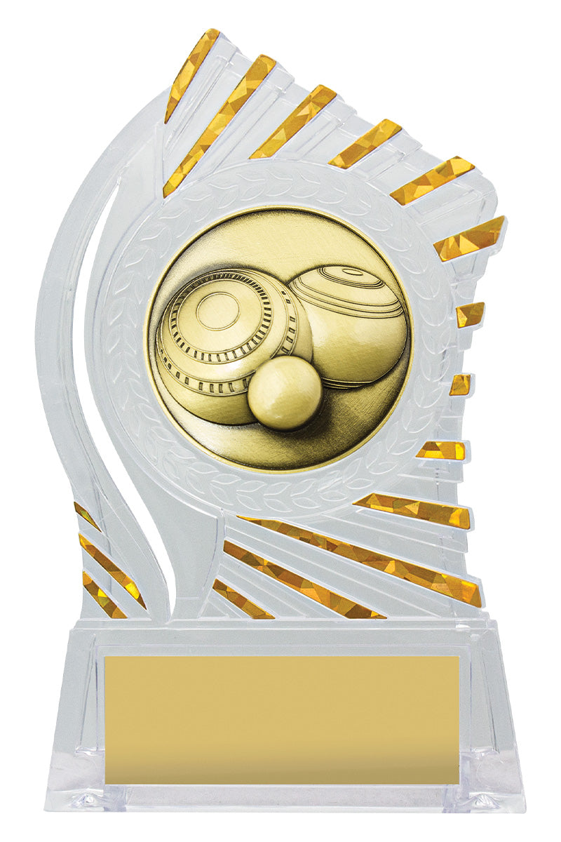 Exciting design of acrylic trophy showcases the gold theme for your sport or trophy. An affordable award with terrific space for your engraving.