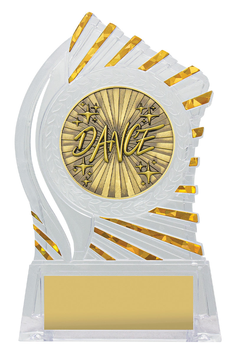 Exciting design of acrylic trophy showcases the gold theme for your sport or trophy. An affordable award with terrific space for your engraving.