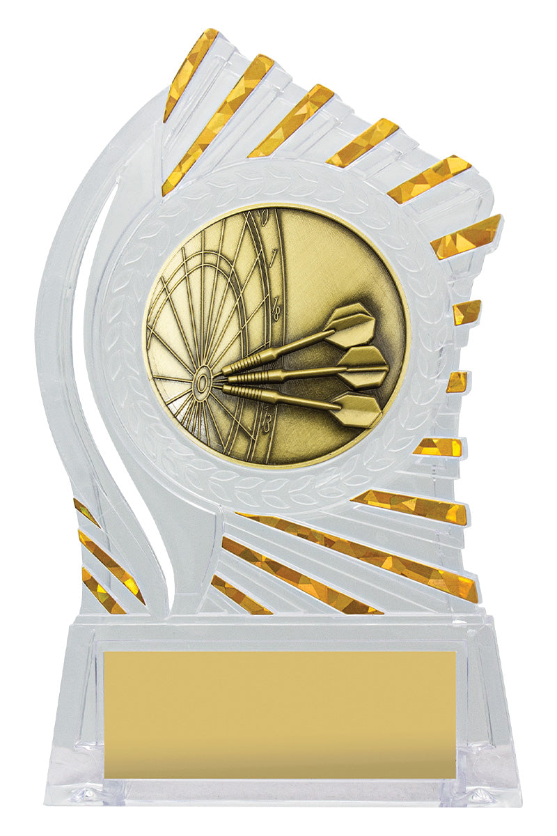 Exciting design of acrylic trophy showcases the gold theme for your sport or trophy. An affordable award with terrific space for your engraving.