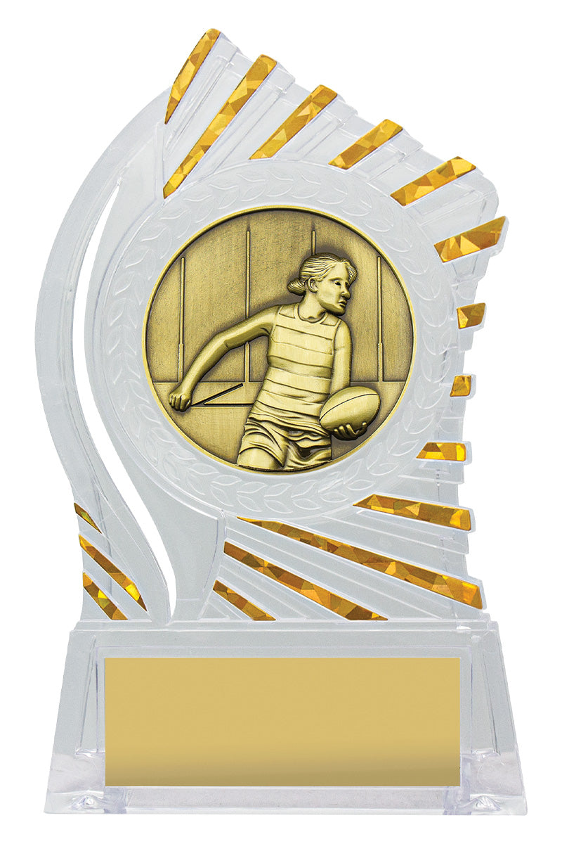 Exciting design of acrylic trophy showcases the gold theme for your sport or trophy. An affordable award with terrific space for your engraving.