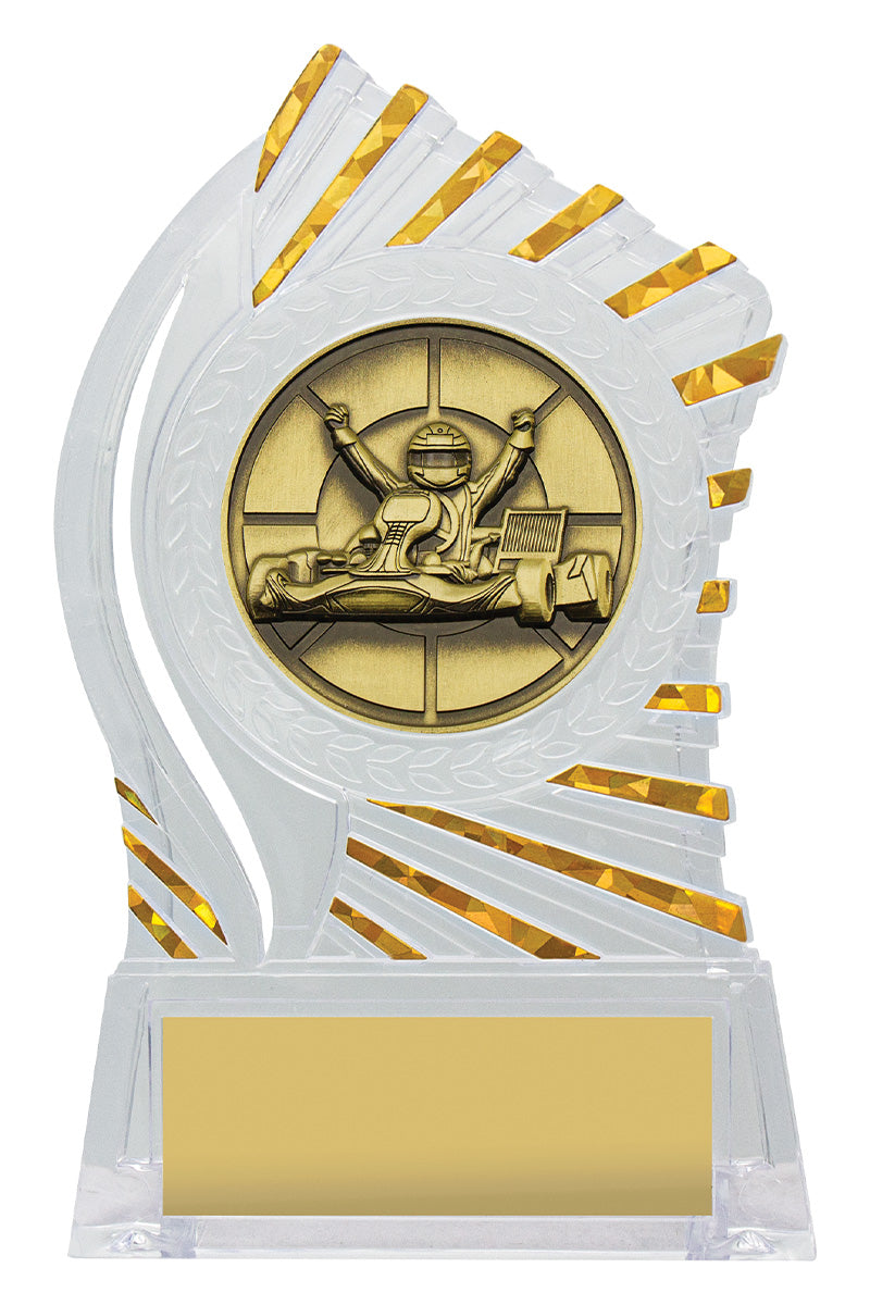 Exciting design of acrylic trophy showcases the gold theme for your sport or trophy. An affordable award with terrific space for your engraving.