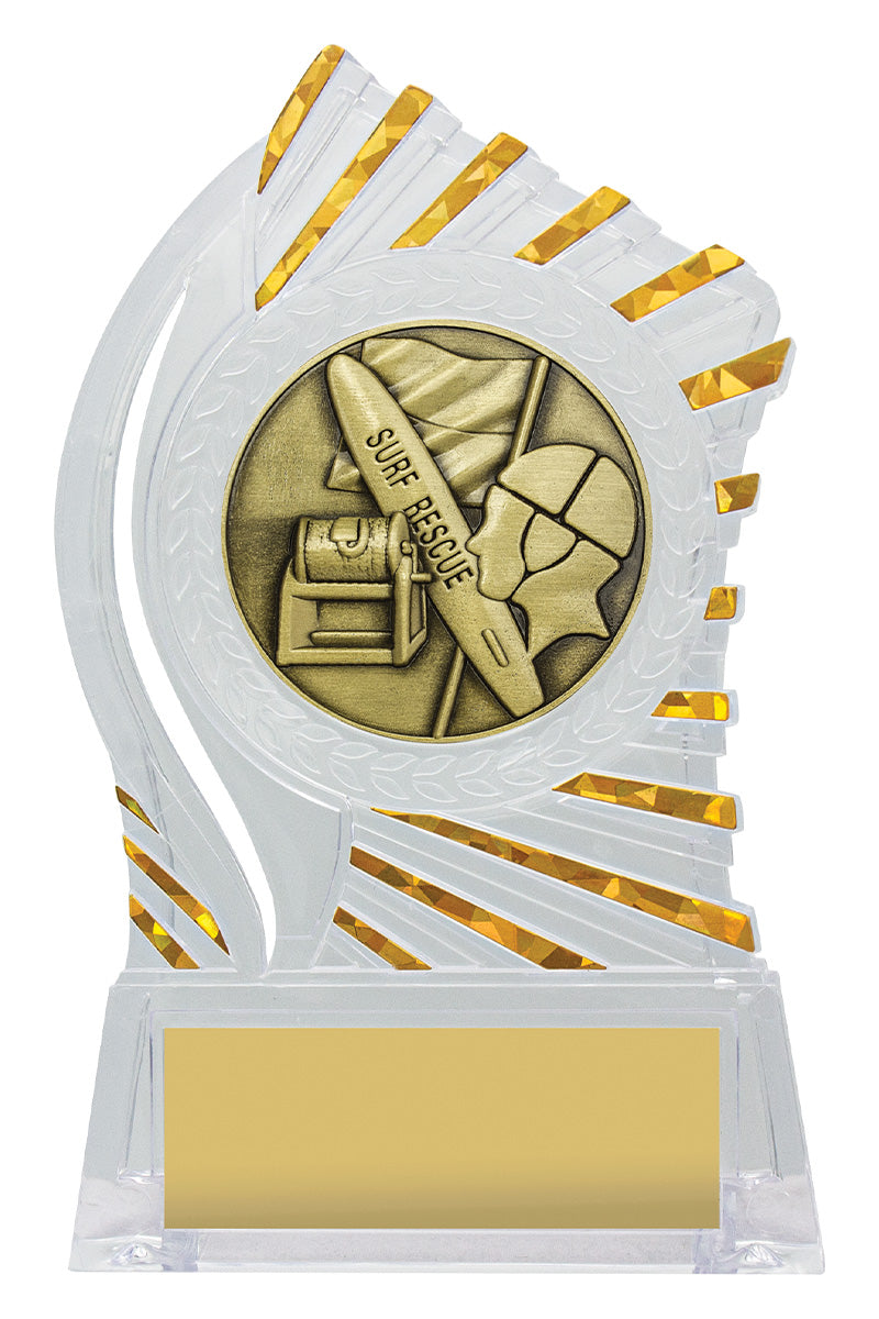 Exciting design of acrylic trophy showcases the gold theme for your sport or trophy. An affordable award with terrific space for your engraving.