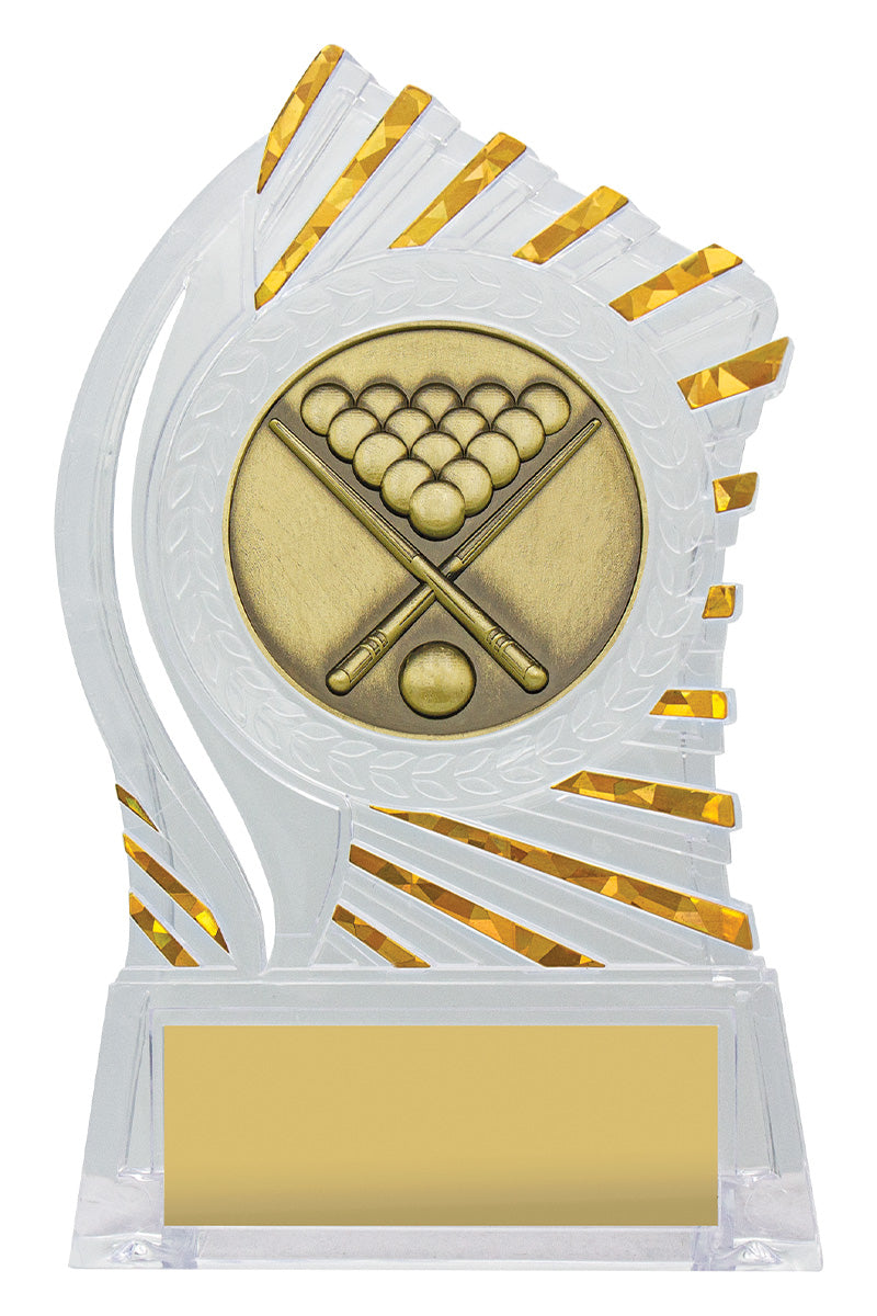Exciting design of acrylic trophy showcases the gold theme for your sport or trophy. An affordable award with terrific space for your engraving.