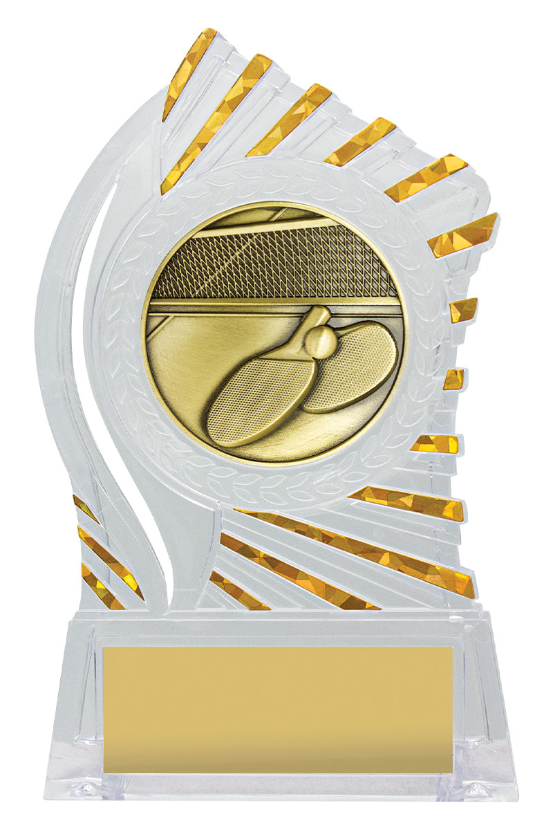 Exciting design of acrylic trophy showcases the gold theme for your sport or trophy. An affordable award with terrific space for your engraving.