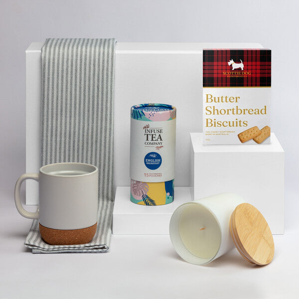 Lift open the magnetic-close box and you’ll find everything needed for a cosy coffee or tea ritual. A sleek ceramic coffee mug with an insulated cork base. A softly glowing vanilla-scented candle. Rich English Breakfast tea and Scottie Dog Shortbread Biscuits for the perfect pairing. Finished with a soft pinstripe cotton tea towel, The Brew Ritual is equal parts practical and indulgent – ideal for thoughtful gifting.