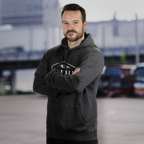 ed Unisex Hoodie is made from a soft and durable blend of combed cotton and polyester, featuring midweight 280gsm brushed fleece for warmth without the bulk. The acid wash finish gives it a lived-in look, while ribbed cuffs and hem holds its shape. Available in eight Australasian sizes.