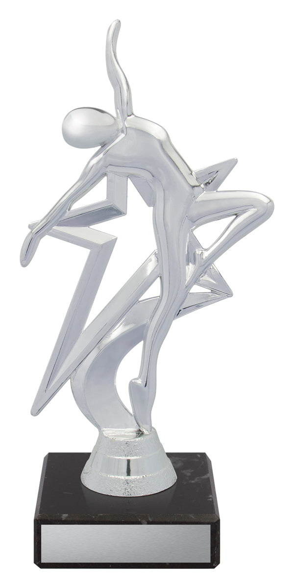 Outstanding series of dance trophies feature star riser component and brilliant abstract dance top in shiny silver. Change colour of column to suit your awards.