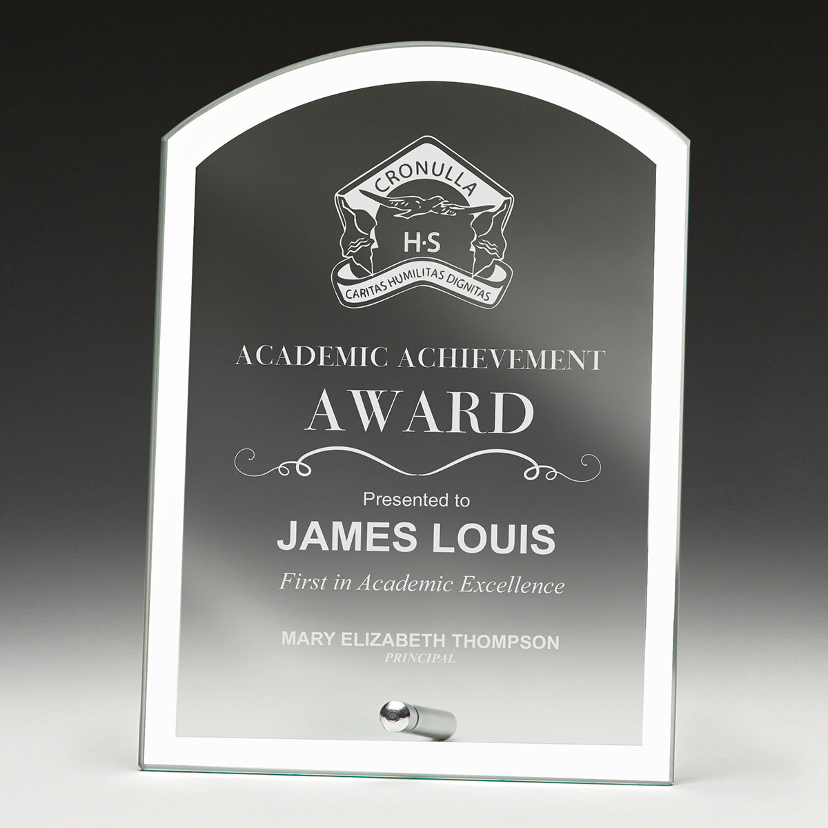 Unique shape of glass plaque with silver highlights offers a point of difference when looking for an affordable award for your event. Available in multiple sizes - supplied in gift box.