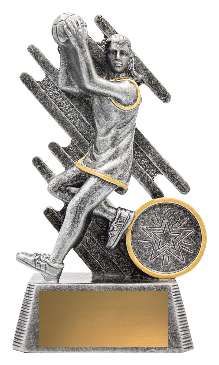 Zoom Series showcases Netball player in action against a stylised backdrop and finished in classic antique silver. Available in multiple sizes and includes space for custom logo.